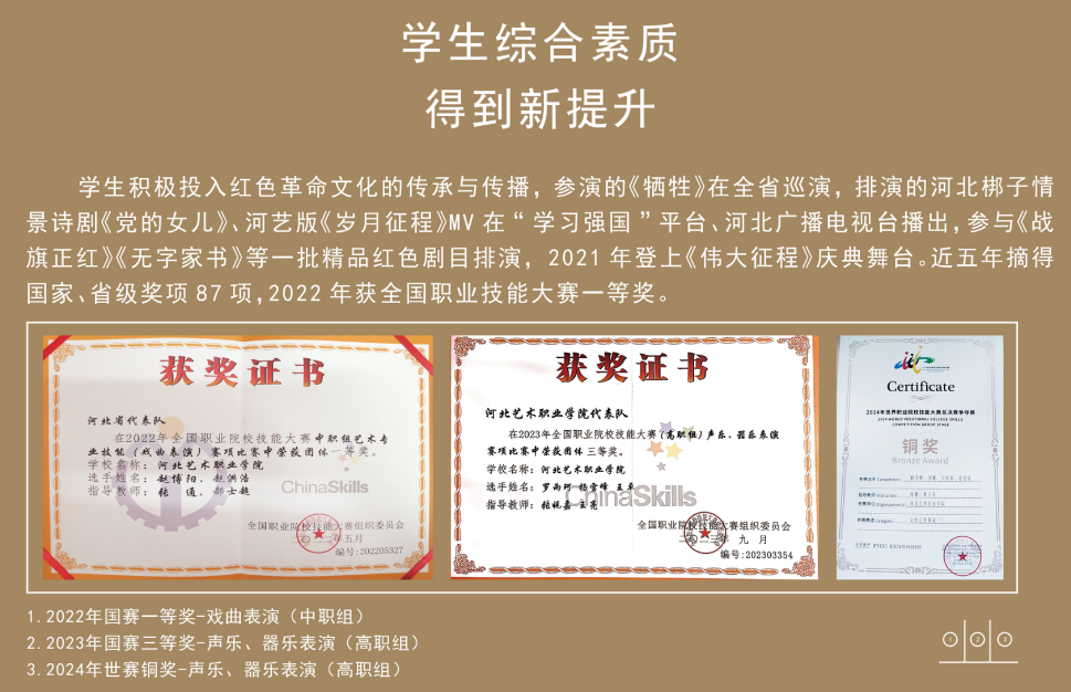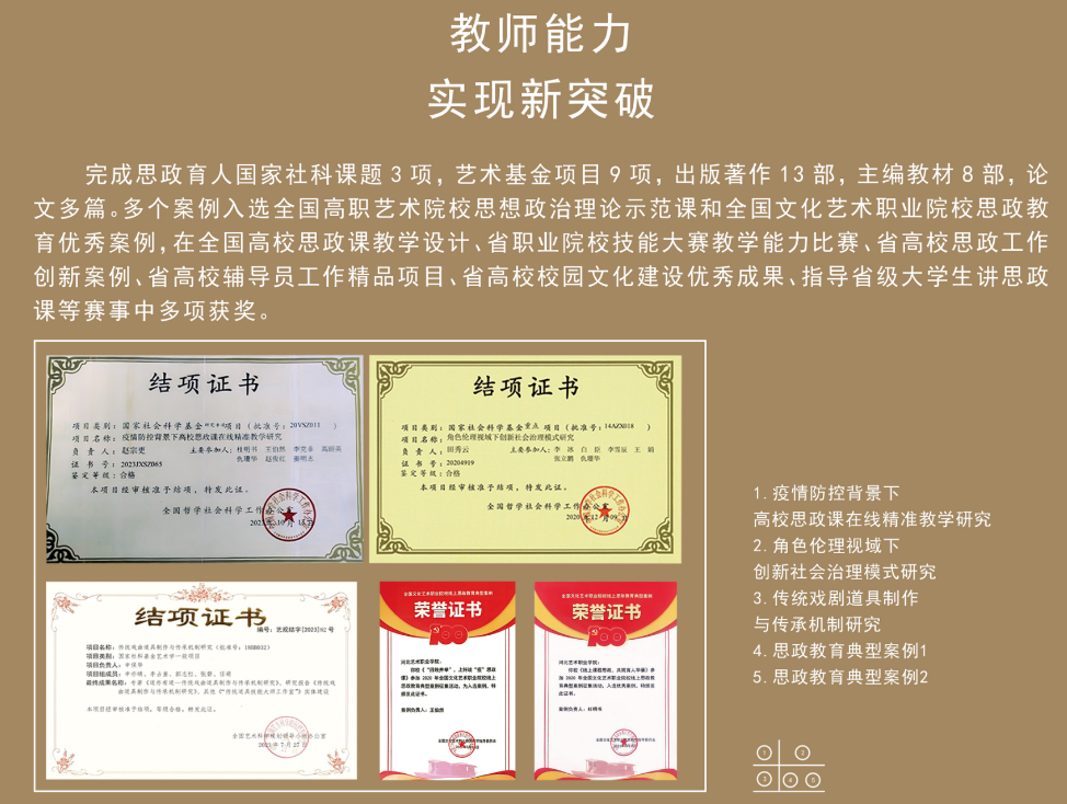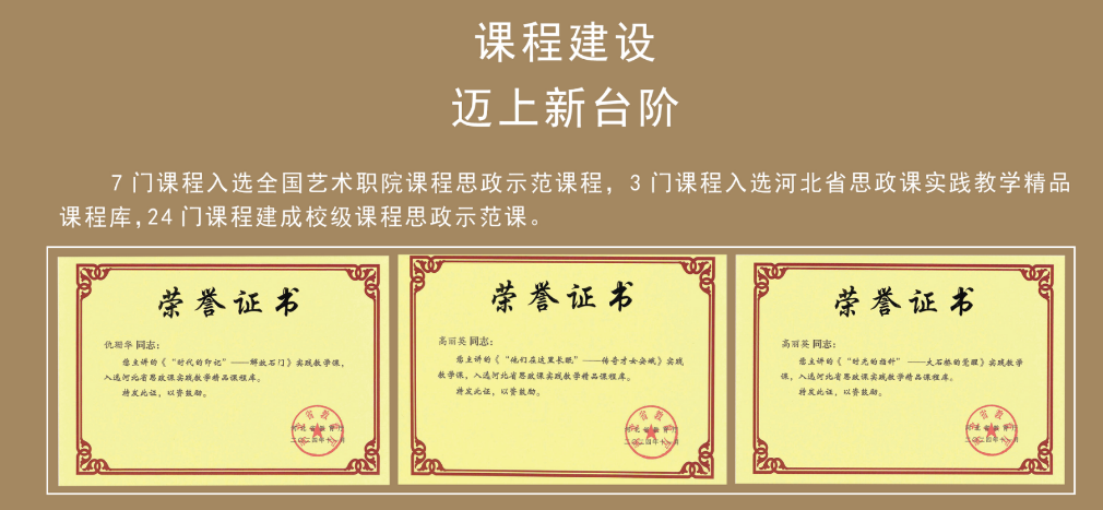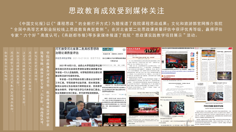 学院始终将思政教育贯穿艺术人才培养全过程,改革开放后全面恢复思想政治理论课教学体系,80年代初制定《学生思想品德考核办法》,90年代贯彻“德艺双馨”育人理念,逐步形成“思政+艺术”育人模式。2001年升格高职后,学院党委高度重视,认真贯彻习近平总书记关于高校思想政治工作的重要讲话和指示精神,设立思政教学部,先后成立“课程思政教学研究中心”与“课程思政实践教学中心”;加强课堂教学主阵地,将院领导讲思政课固化为常态机制;制定年度思想政治教育工作实施意见,构建系统化、多层次思政育人体系,推动学院思政教育的长效发展,培养了大批德艺双馨人才。