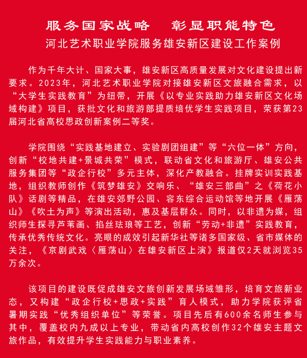 国防教育“五到位”扎实有效,军事训练、国防后备营建设征兵工作成效突出。构建心理健康教育“五位一体”工作模式和四级预警网络。通过学生代表大会、院长学生面对面等形式,培育学生民主意识与主体责任。学生在深度参与雄安新区文化场域建设、“三下乡”“挑战杯”“体验省情 服务群众”等社会实践、竞赛活动中屡获佳绩。