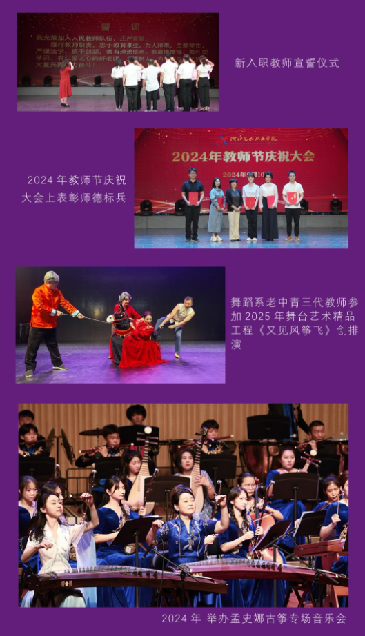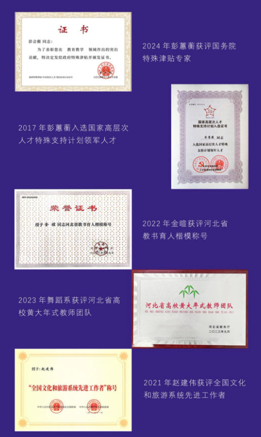 建有舞蹈表演专业国家级双师培训基地、表演艺术类专业省级双师培训基地,获批省级教师教学创新团队和黄大年教师团队,涌现出国家万人计划领军人才、国务院特殊津贴专家、燕赵文化名家、燕赵文化英才、省“三三三”人才、省教书育人楷模、全国文旅系统先进工作者等一批优秀教师。
