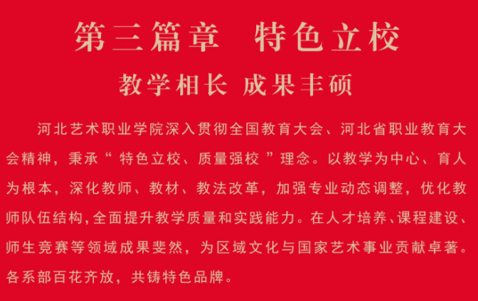 各系部强化艺术实践教学:组织学生参与《天边的鼓声》等大型剧目创排,参与央视春晚、建党百年《伟大征程》等国家级重大演出,七十年间,学院传承宋德珠、贾桂兰等艺术名家精神,为河北乃至全国培养了大批优秀艺术人才,形成了艺术人才培养的创新模式,实现了人才培养与行业需求的精准对接。