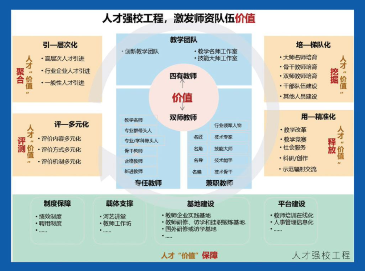 建立教师发展中心,构建统筹协调、全面精准的人事政策体系。明晰教师发展标准,遴选教学名师 3 人、青年拔尖人才 7 人、专业带头人 19 人、骨干教师 58 人,形成了系统完善的由合格教师、骨干教师、专业带头人、到教学名师,逐步进阶的教师发展路径。改革评价激励机制,建立健全优秀教师表彰奖励制度,加大对教学名师、优秀团队、重大成果的奖励力度。