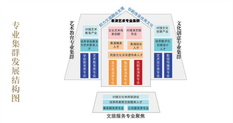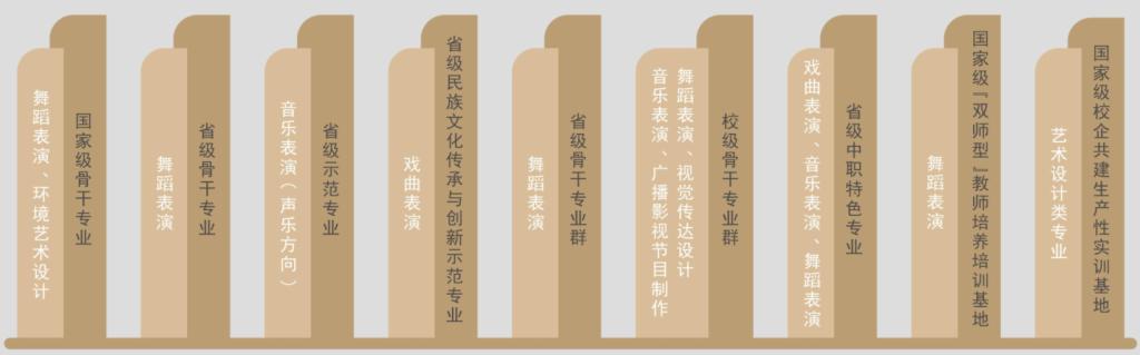 学院立足艺术职业教育特点,构建“一体两翼一拓展一特色”专业格局。各专业系部在学院整体布局下协同发展,专业设置从建校初期的戏曲表演逐步拓展至音乐、舞蹈、美术、戏剧、影视等领域的 29 个专业。建设成果丰硕,获评首批全国职业院校民族文化传承与创新示范专业点(戏曲表演),拥有舞蹈表演、环境艺术设计2个国家级骨干专业,1个省级示范专业(音乐表演),1个省级骨干专业群(舞蹈表演)。同时建有国家级"双师型”教师培养培训基地(舞蹈表演)、国家级校企共建生产性实训基地(艺术设计类专业),形成了中高职衔接、多层次培养的专业体系,为培养复合型艺术人才奠定了坚实基础。