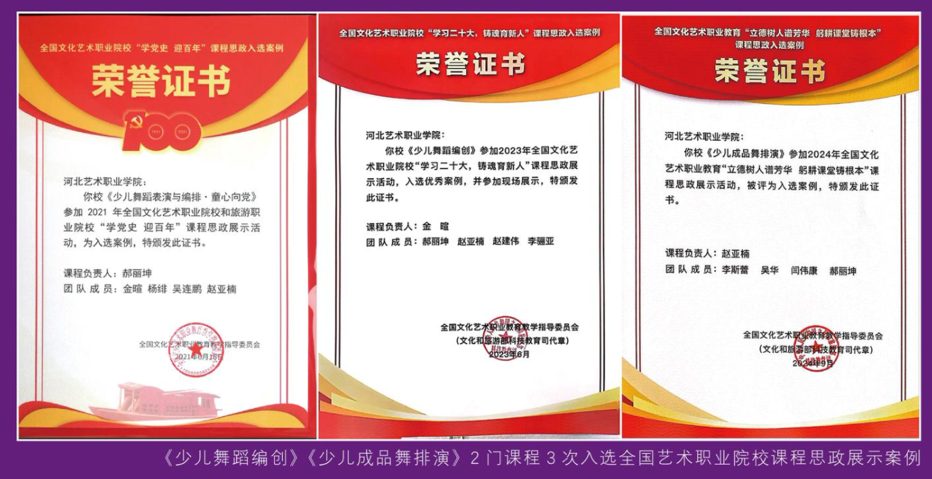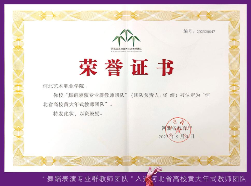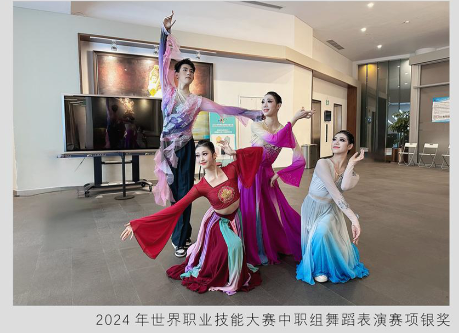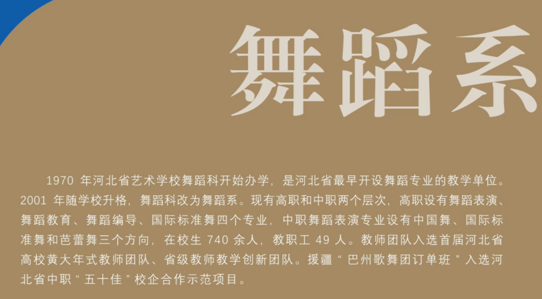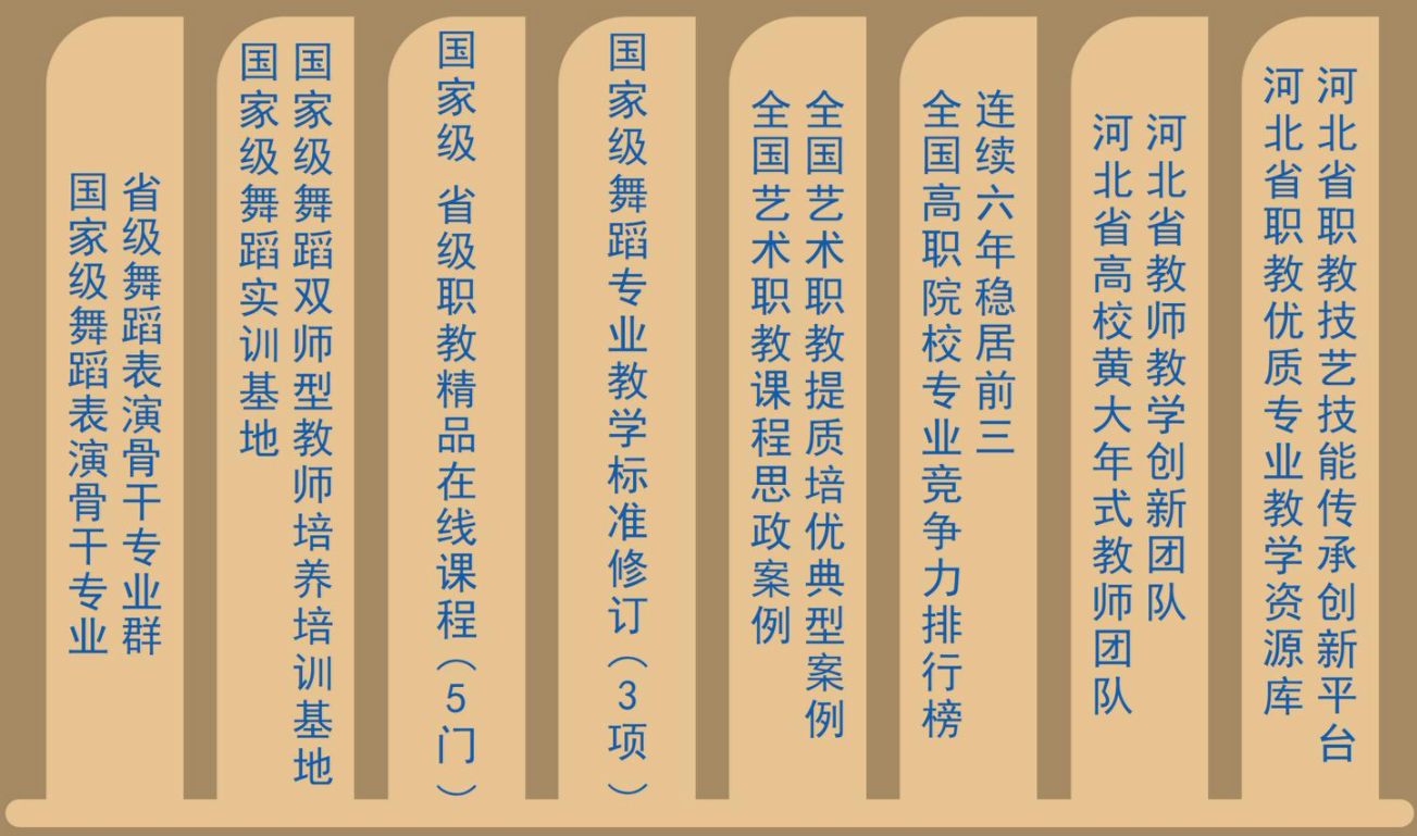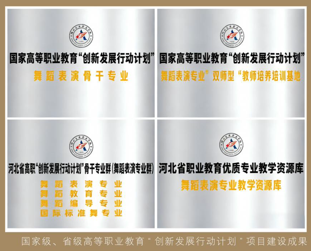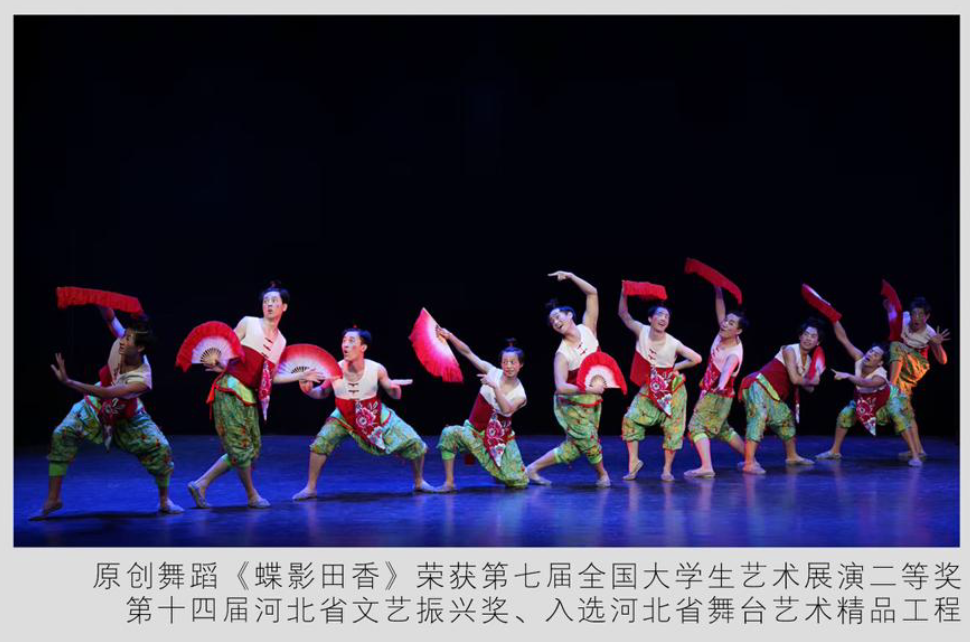自 2001年起,舞蹈系持续探索育人路径,逐步构建起“学·演·赛·创”四位一体,融合订单合作与现代学徒制的“4+2”特色育人模式,形成“课堂教学固基础、实训演出练技能、参赛历练出成果艺术创作铸精品”的人才培养格局。在赛事实践中,师生团队成果丰硕: 在世界职业院校技能大赛、全国职业院校技能大赛、“ 桃李杯”舞蹈比赛、“芳华杯”艺术职业教育舞蹈教学技能竞赛、全国舞蹈展演、全国大学生艺术展演等国家级重要赛事及展演活动中累计入选及获奖 32 项,斩获省级奖项 300 余项;其中 12 名国际标准舞专业学生成功入选国家奥林匹克体育舞蹈国家青年队。在艺术创作领域,舞蹈系积极拓展实践维度:原创剧目《罗汉之门》《寻》入选国家艺术基金资助项目,《又见风筝飞》《蝶影田香》入选河北省舞台艺术精品工程项目;与优质企业联袂打造原创舞剧《红山女神》《大道记忆》,以艺术作品传递文化内涵,彰显专业教学与创作实践的融合成效。