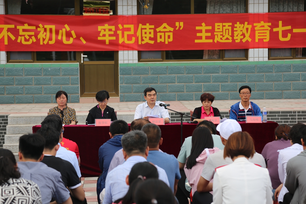 7月2日下午,“不忘初心、牢记使命”主题教育七一党建活动大会暨2018年度优秀党员表彰会在老虎沟门村委会大院隆重举行。党委书记赵宗更首先引领全体党员同志重温了入党誓词,通过庄严宣誓,共忆初心,牢记使命。随后,赵书记以“学习总书记人民情怀——不忘初心、牢记使命,在脱贫攻坚和立德树人中建功立业”为题,为大家上了一堂生动的党课。