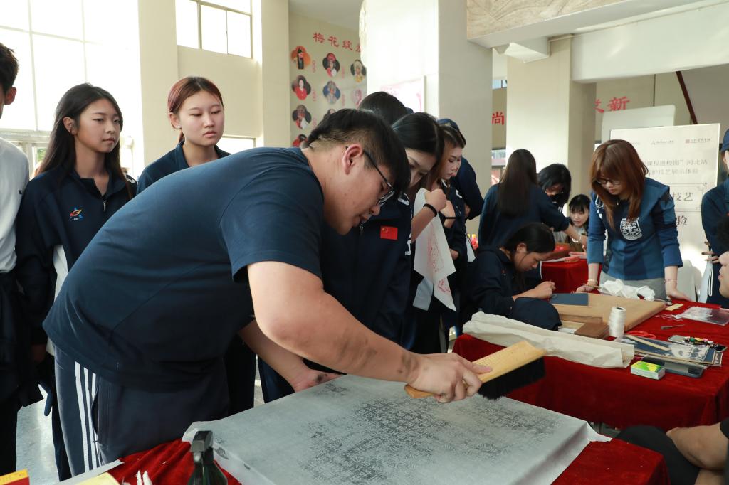 讲座结束后,河北省图书馆与河北艺术职业学院文物修复与保护专业组织了古籍修复、传拓等技艺观摩体验活动。与会嘉宾及师生代表积极参与了现场体验:在雕版印刷体验区亲手印刷,感受古老技艺;在线装古籍装帧体验区穿针引线,学习传统书籍装帧制作;在古籍修复技艺展演前驻足细览,零距离感受古籍修复的魅力。