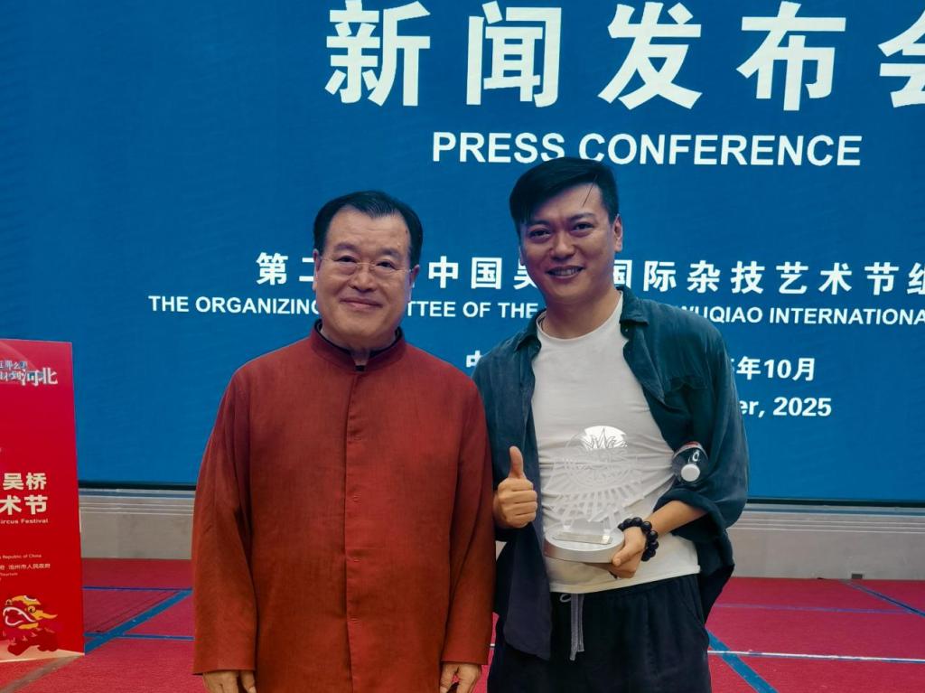 高东老师(右一)在颁奖仪式上与中国文联副主席、中国杂技家协会主席、河北省文联主席边发吉(左一)合影