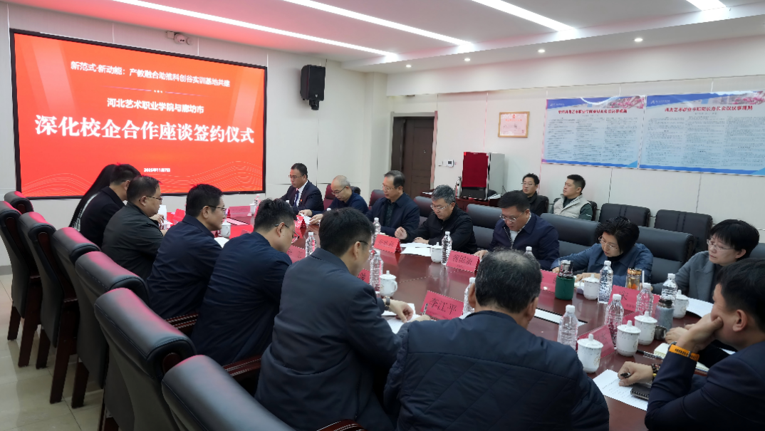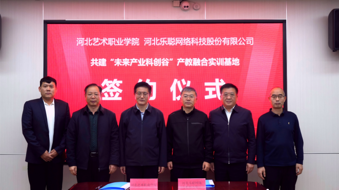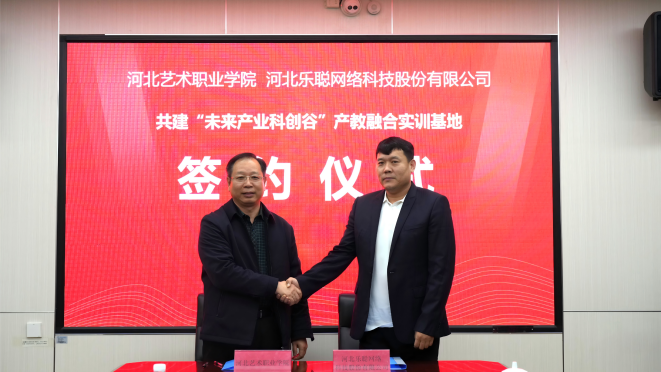 11月7日,河北艺术职业学院与河北乐聪网络科技股份有限公司正式签署战略合作协议,携手共建“未来产业科创谷”产教融合实训基地。河北省文化和旅游厅党组副书记、副厅长、一级巡视员张胜利,廊坊市委常委、宣传部部长杨军出席深化校企合作座谈签约仪式,河北艺术职业学院党委书记蒋国新主持仪式。河北艺术学院院长冯彦瑞,省文化和旅游厅科教处处长王进军,廊坊市教育局党组成员、副局长张辉,廊坊经济技术开发区投资促进和招商合作二局局长李江平、文教卫生局副局长李雨,河北乐聪网络科技股份有限公司董事长王润杰及学院相关处室负责同志参加活动。