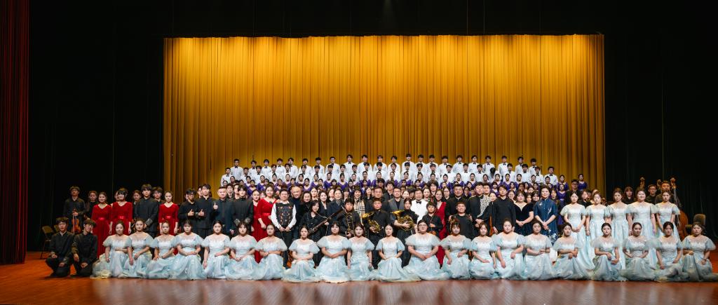 压轴巨献《黄河大合唱》由三校乐团联袂演出,在中国音乐学院青年教师谭喜露的指挥下,河北艺术职业学院校友陈文胜、中国音乐学院研究生邱佳裕、河北艺术职业学院在校生鲁佳怡与三校师生以饱满激情再现了这部镌刻民族气节的不朽史诗,将现场气氛推向高潮。其中配乐朗诵《黄河之水天上来》激昂澎湃又深沉凝重,女声独唱《黄河怨》悲痛哀怨而如怨如诉,让观众仿佛置身于抗日战争的烽火岁月,感受到了中华儿女保卫祖国、抵御外敌的坚定信念。合唱《黄水谣》细腻而深情,如同黄河的潺潺流水,诉说着中华民族的历史故事;合唱《怒吼吧!黄河》主调与复调相结合,以慷慨悲歌的旋律气吞山河,展现出中华民族在艰难困苦中奋勇前行的决心。