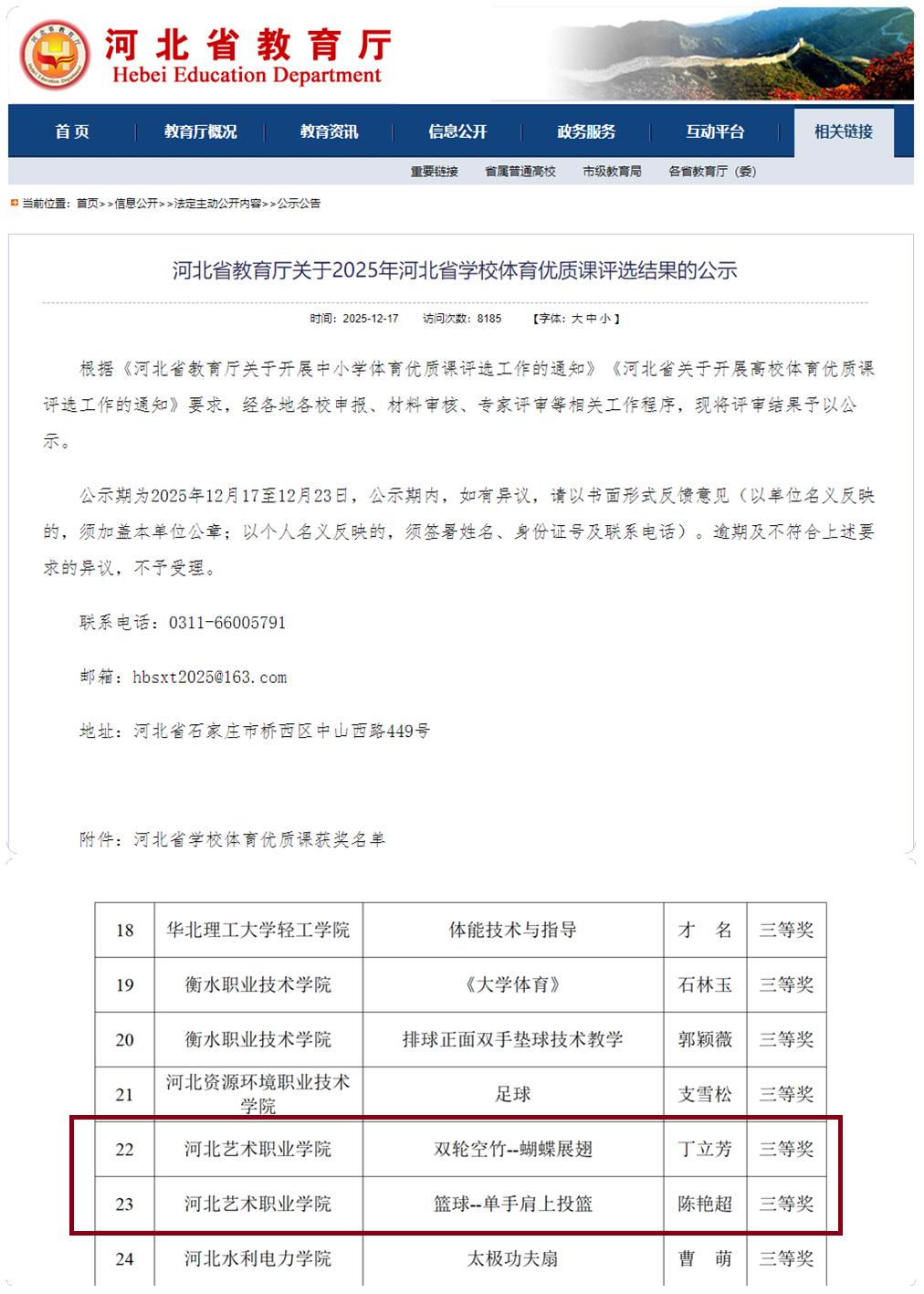 日前,河北省教育厅公布了2025年河北省学校体育优质课评选结果,河北艺术职业学院丁立芳老师的《双轮空竹——蝴蝶展翅》课程和陈艳超老师的《篮球——单手肩上投篮》课程分别荣获三等奖。