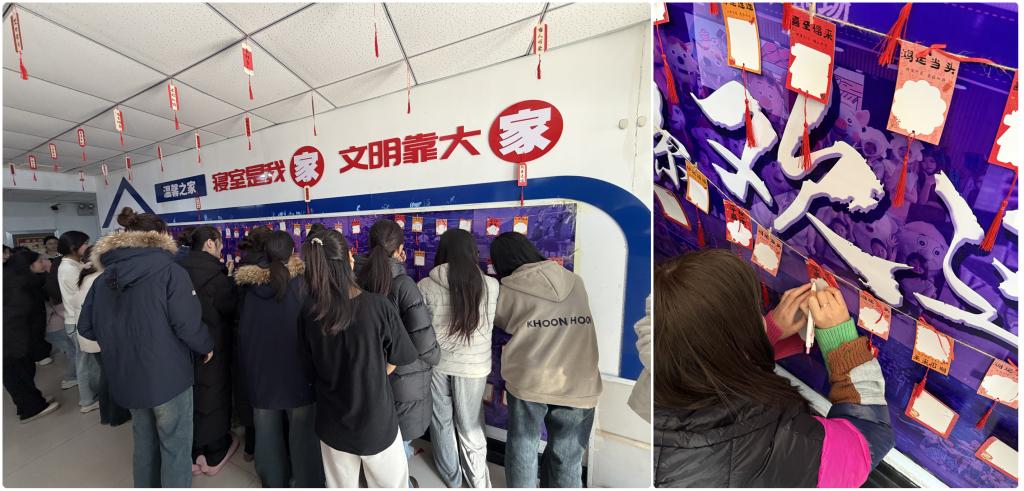 舞蹈表演结束后,学子们纷纷驻足公寓大厅文化墙前,拿起笔写下对后勤工作人员的感恩祝福与新年期盼。“愿宿管阿姨平安喜乐”“感谢食堂大叔的暖心饭菜”等字句质朴真挚,将心底的敬意与温情定格在笔墨之间,让文化墙成为传递爱与温暖的载体,也让感恩之心在一句句祝福中愈发坚定。