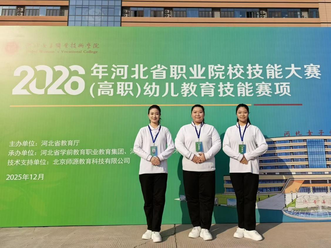 2025年12月27日至28日,河北艺术职业学院由艺术教育系王梦瑶、薛梦晗、谷佳怡三位同学组成的代表队,在索娅敏、马凤辗两位教师带领下参加2026年河北省职业院校技能大赛(高职)幼儿教育技能赛项并荣获团体一等奖。
