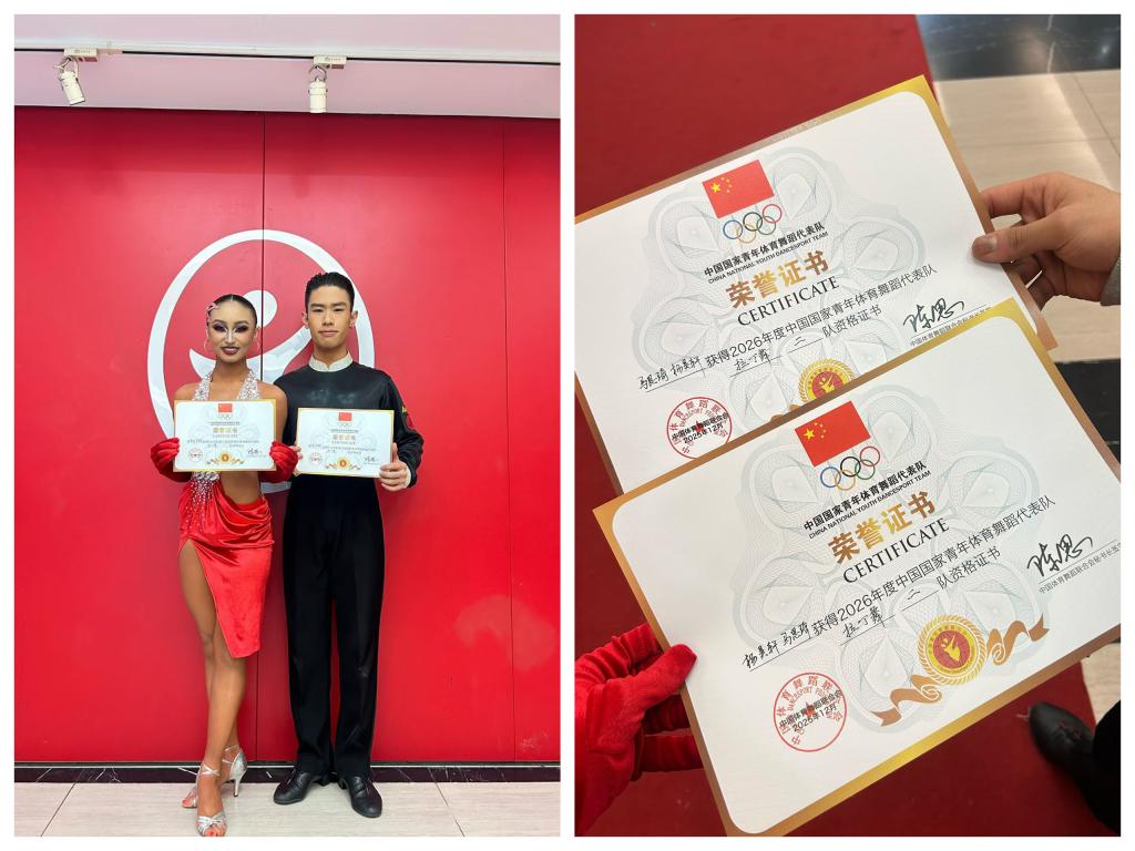 中国体育舞蹈联合会的国家青年代表队选拔程序严格,其核心目标是集结国内顶尖的青年选手,进行专业化培养与集训,以备战国际赛场,代表中国体育舞蹈的未来竞争力。杨昊轩、马思琦两位同学入学以来,始终保持着对舞蹈艺术的热爱与执着,在日常训练中刻苦钻研,在专业课堂上虚心求教,在各类赛事中磨砺成长。两人从激烈的竞争中脱颖而出入选国家队,不仅是对个人刻苦训练与辛勤付出的高度认可,更是对我院国标舞专业教学成果与人才培养模式的充分肯定。