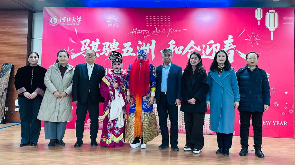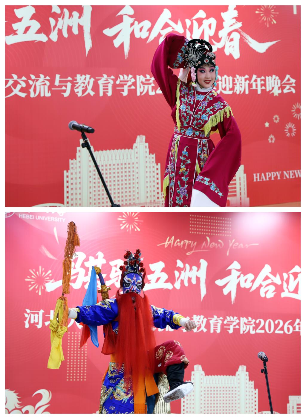 为积极推动戏曲艺术的国际传播,深化校际文化交流,展示学院戏曲专业办学特色,应河北大学国际交流与教育学院邀请,2025年12月30日,我院社会教育部、戏剧系师生参加该校2026年留学生新年晚会,开展了内容丰富、形式生动的戏曲文化展示与交流活动。