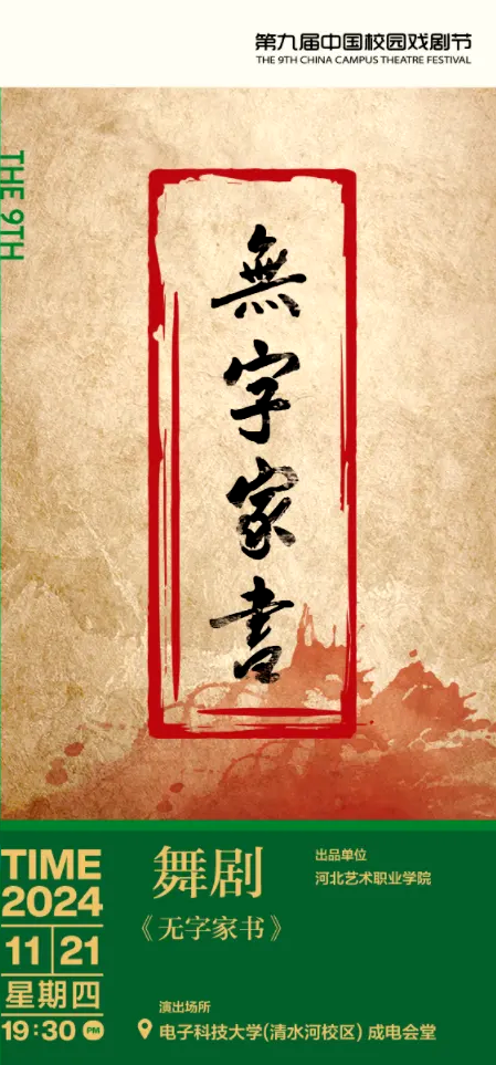 ——11月21日,原创舞剧《无字家书》赴成都参加由中国戏剧家协会、四川省政府主办的第9届“中国校园戏剧节”。《无字家书》是学院立足实践育人,推进革命文化进教材、进课堂、进头脑而倾力打造的一部红色题材原创作品。该剧以烈士陈毅安为人物原型,围绕他和爱人李志强的家书故事进行叙事和改编,再现了革命先辈们在残酷的战争年代为追求革命理想而展现出的大无畏的英勇牺牲精神、忠贞不渝的爱情守望和坚若磐石的革命信仰。