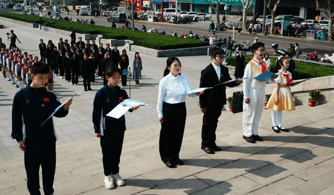 上午10时许,全体人员有序转场至石家庄解放纪念碑,核心祭扫仪式正式启动。伴随着庄严的国歌旋律,现场全体人员肃立致敬;一分钟默哀环节,哀思与敬意在广场静静流淌,向为民族独立、人民解放、国家富强英勇献身的革命先烈致以最深切的缅怀。在“大手拉小手”联合献词环节,来自三所院校的学生代表以青春之声诉说对先烈的敬仰,以铿锵誓言承诺传承使命,字字句句凝聚着新时代青少年的家国情怀。随后开展的主题微党课,石家庄市范西路小学党支部书记以《长征胜利90周年,走好新时代的“接力长征”》为题,结合长征英烈事迹与河北红色历史,为不同学段学生分层传递红色精神:用生动故事让小学生读懂“坚守”,用责任担当让中学生领悟“使命”,用时代要求让大学生明确“方向”,深入浅出的讲解让红色精神浸润心灵。“三级誓言 薪火相传”宣誓仪式将活动推向高潮,在党旗、团旗、队旗的见证下,全体党员、团员、少先队员依次庄严宣誓,“党建带团建、团建带队建”的阶梯式育人格局彰显无遗,铮铮誓言回荡在纪念碑上空,凝聚起强国复兴的青春力量。