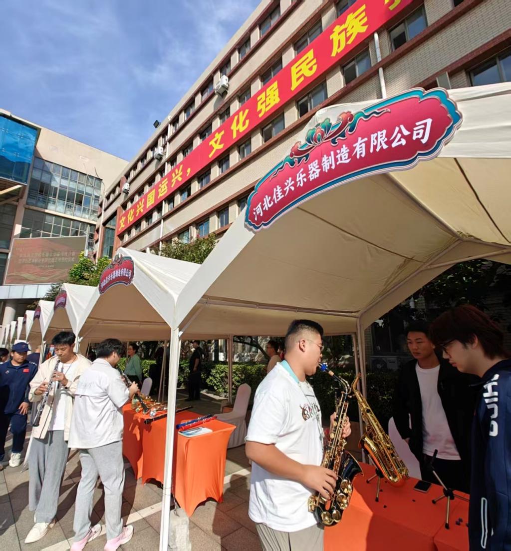 活动现场,金音、正欧、佳兴等武强乐器企业带来了精品乐器,生动展现了“中国管弦乐器产业基地”的匠心工艺,进一步彰显和契合了武强县“年画之乡”“乐器之都”的深厚文化底蕴。河北艺术职业学院音乐专业师生现场试奏各类乐器,与武强周窝音乐小镇的文旅宣传名片在河艺校园交相辉映,凸显“乐器制造+音乐教育+文旅体验”三维沉浸式融合。