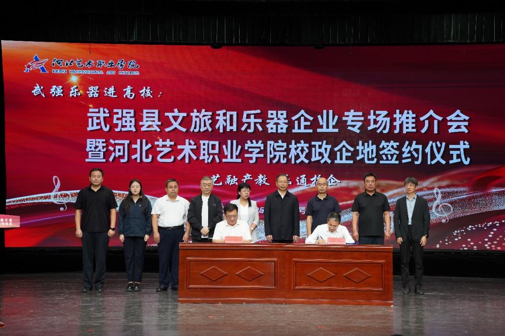 在现场领导和全体人员的见证下,武强县与河北艺术职业学院签署《校政企地合作框架协议》。协议明确共建“乐器智造与文旅融合”一体化校企合作基地、探索“招生—培养—就业”一体化合作培养项目、共同策划系列文旅融合和产业调研主题活动以及创新人才培养模式等重要内容。