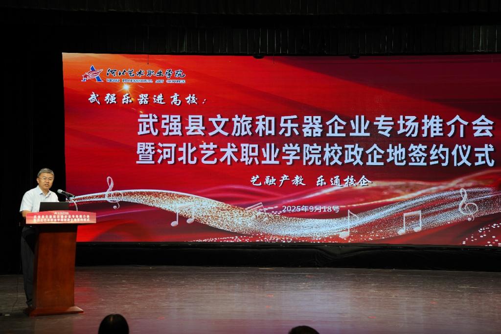 9月18日上午,衡水市武强县文旅和乐器企业专场推介会暨河北艺术职业学院校政企地签约仪式在河北艺术职业学院举行。活动以“武强乐器进高校:艺融产教 乐通校企”为主题,通过政府搭台、校企联动,构建“教育链+产业链+创新链”深度融合的生态体系。河北省文化和旅游厅党组副书记、副厅长、一级巡视员张胜利在致辞中,希望合作各方此次签约为新起点,不断完善融合发展体制机制,积极探索合作新模式、拓展合作新领域,切实推动教育链、人才链与产业链、创新链有机衔接,开创文旅融合、产教融合发展新局面。武强县委书记门保彬代表县委、县政府同河北艺术职业学院党委书记蒋国新共同签署框架协议。河北艺术职业学院院长冯彦瑞、武强县副县长樊春华分别致辞。河北艺术职业学院副院长金暄主持推介会及签约仪式。